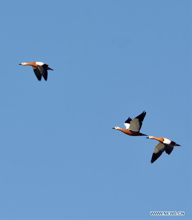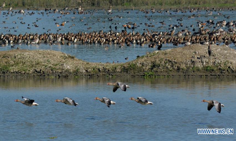 Migratory birds are seen at a wetland in Pobitora wildlife sanctuary on the outskirts of Guwahati, India's Assam State on Nov. 10, 2020. (Str/Xinhua)