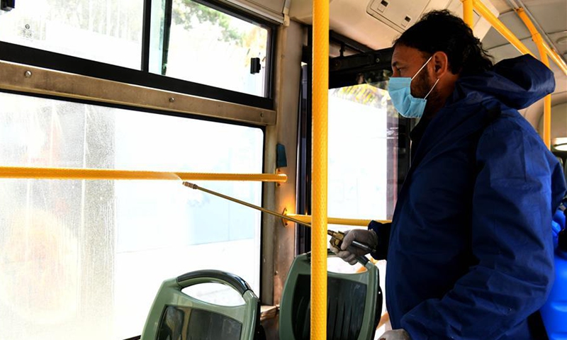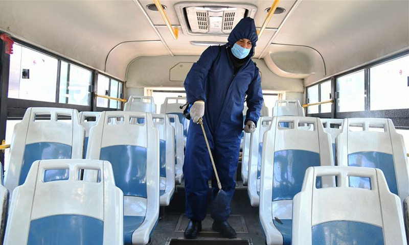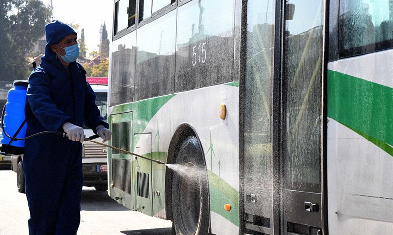 A worker sprays disinfectant on a bus in Damascus, Syria, on Nov. 10, 2020. (Photo by Ammar Safarjalani/Xinhua)