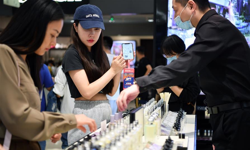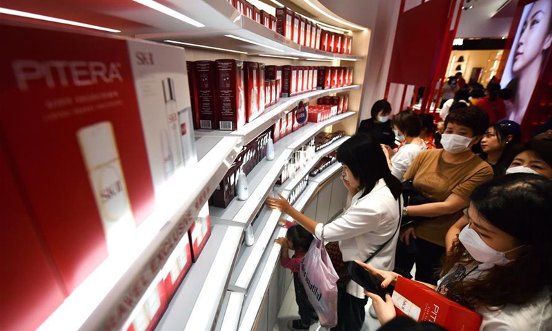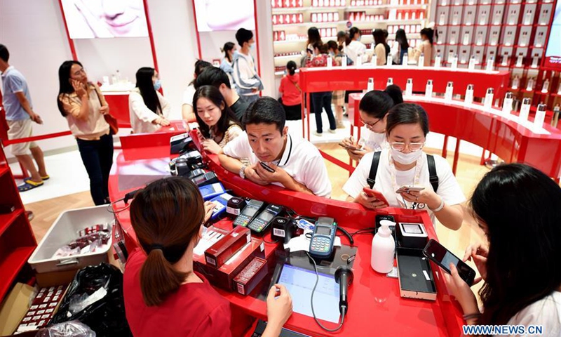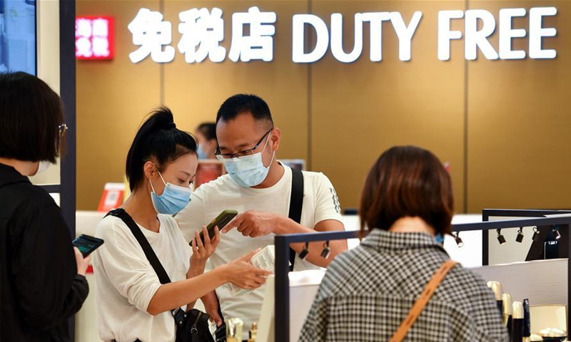 People shop at a duty-free store in Haikou, capital of south China's Hainan Province, Nov. 10, 2020. Sales of offshore duty-free shops in south China's island province of Hainan exceeded 12 billion yuan (about 1.8 billion U.S. dollars) from July 1 to Oct. 31, up 214.1 percent year on year, customs data showed. (Xinhua/Guo Cheng)