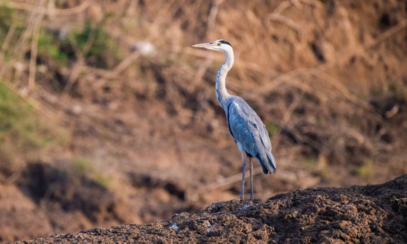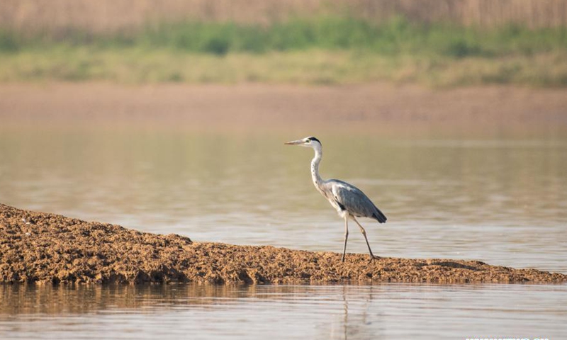 A heron walks at the West Dongting Lake in Changde, central China's Hunan Province, Nov. 11, 2020. The West Dongting Lake, along with its biologically rich wetlands, has been a thoroughfare for migratory birds. About 20,000 migratory birds have arrived at West Dongting Lake so far this year. (Xinhua/Chen Sihan)