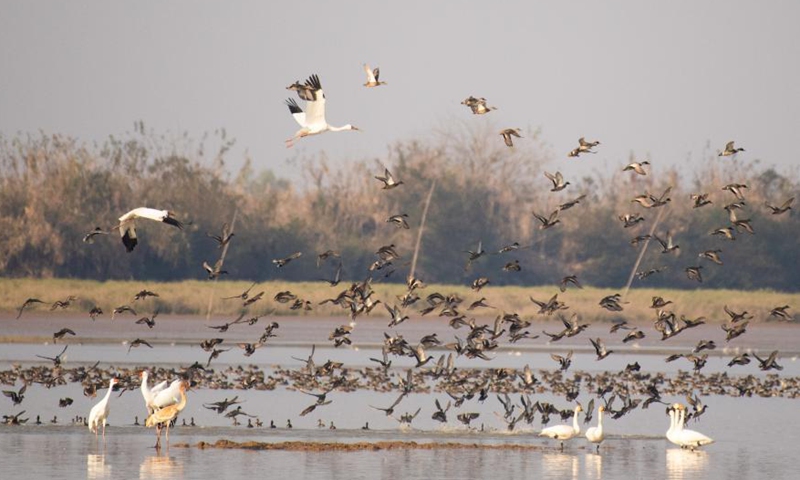 A flock of migratory birds fly over the West Dongting Lake in Changde, central China's Hunan Province, Nov. 11, 2020. The West Dongting Lake, along with its biologically rich wetlands, has been a thoroughfare for migratory birds. About 20,000 migratory birds have arrived at West Dongting Lake so far this year. (Xinhua/Chen Sihan)