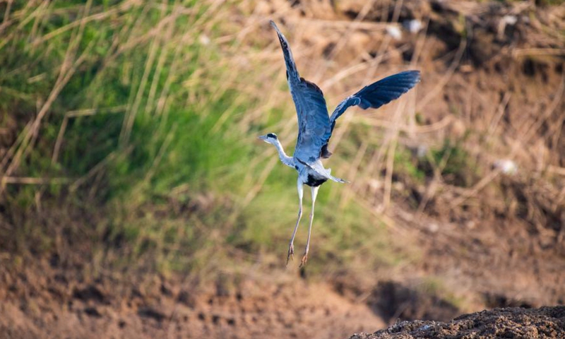 A heron flies at the West Dongting Lake in Changde, central China's Hunan Province, Nov. 11, 2020. The West Dongting Lake, along with its biologically rich wetlands, has been a thoroughfare for migratory birds. About 20,000 migratory birds have arrived at West Dongting Lake so far this year. (Xinhua/Chen Sihan)