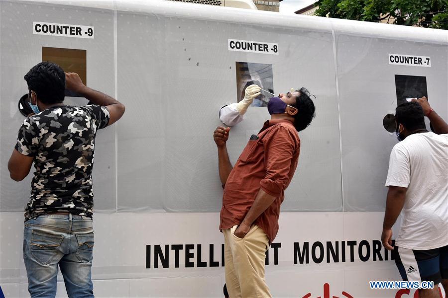 People have tests at a COVID-19 mobile testing facility in Hyderabad, India, on July 31, 2020. India recorded the highest ever single-day spike with 55,078 fresh COVID-19 cases, taking the total tally to 1,638,870, according to the federal health ministry. (Str/Xinhua)