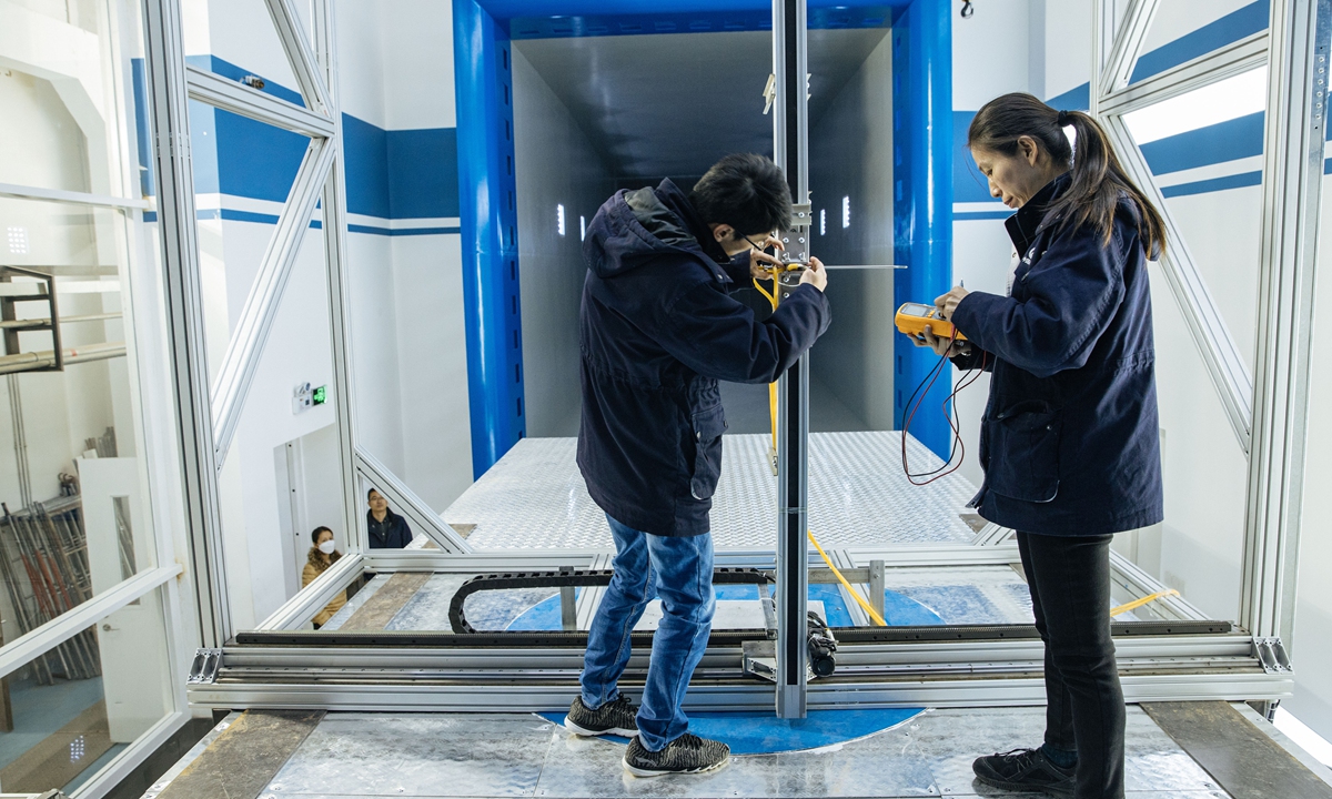 Two staff members check the equipment in the wind tunnel station. Photo: Li Hao/GT
