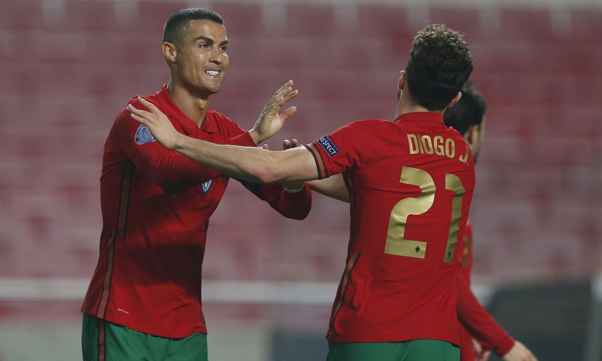 Portugal's Cristiano Ronaldo (left) celebrates scoring with teammates in Lisbon on Wednesday. Photo: IC