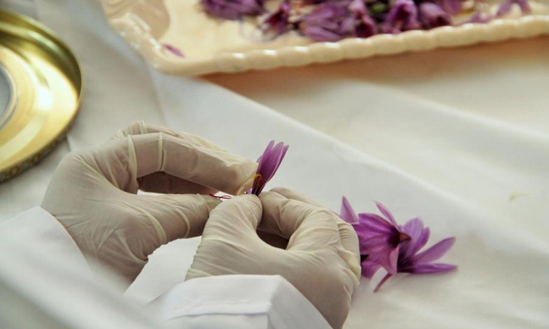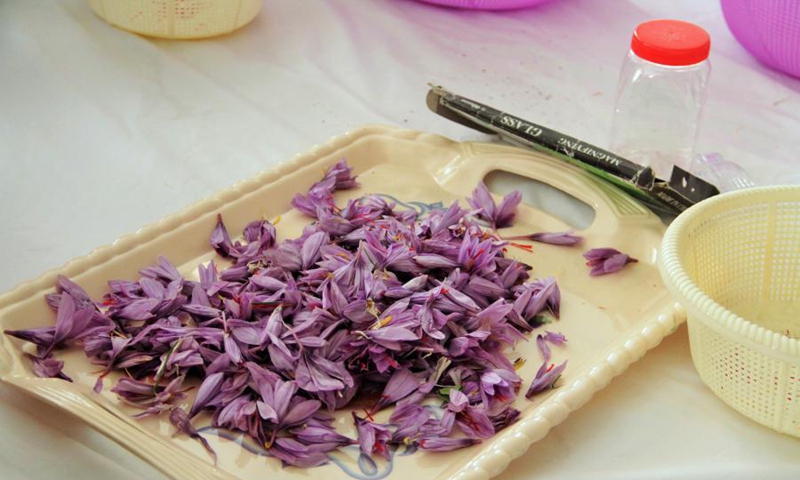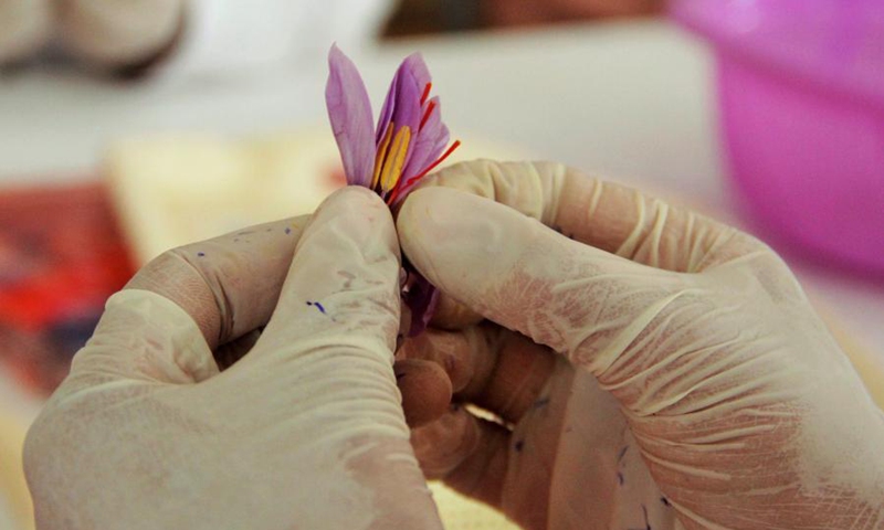A worker separates Saffron stigma from petals at a saffron processing factory in Ghazni city, Afghanistan, Nov. 11, 2020. (Photo by Rohullah/Xinhua)
