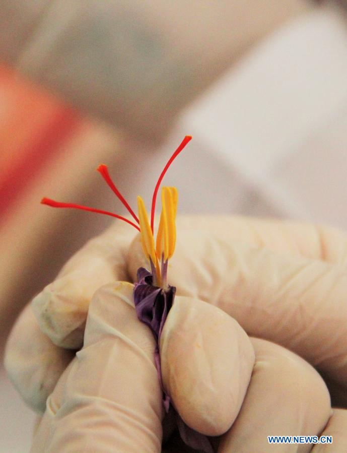 A worker holds separated Saffron stigma at a saffron processing factory in Ghazni city, Afghanistan, Nov. 11, 2020. (Photo by Rohullah/Xinhua)