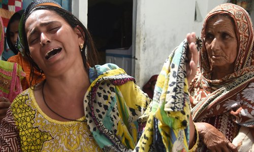 Pakistani woman Arbella Bibi, mother of a six-year-old girl who was raped and murdered, reacts as she mourns with relatives at her home, in Karachi on Tuesday. Crowds took to the streets after the body of the victim was discovered late Monday, blocking a main road in the western suburb of Orangi Town in western Karachi where they hurled stones at riot police. Photo: AFP
