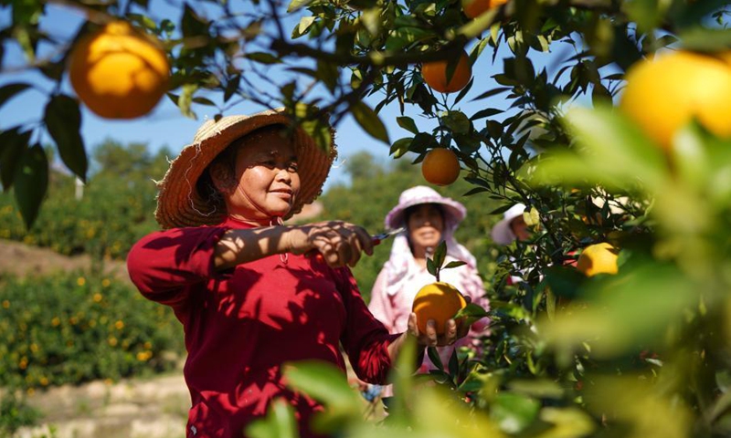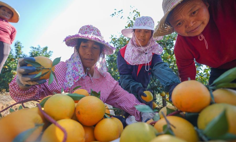 Farmers pick navel oranges at a plantation in Xiaru Village of Shashi Township in Ganzhou City, east China's Jiangxi Province, Nov. 12, 2020. Ganzhou City has planted more than 1.7 million mu (about 113,333 hectares) of navel oranges, with an expected annual output of over 1 million tonnes. (Xinhua/Zhou Mi)