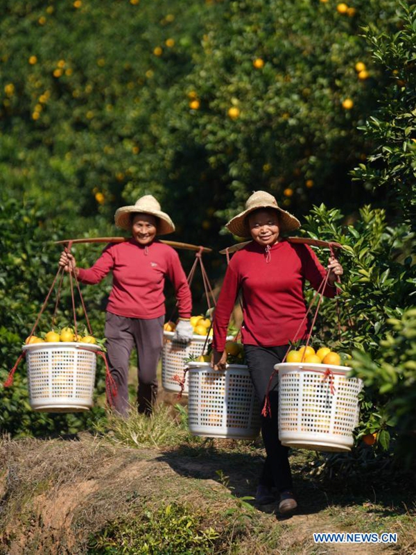 Farmers carry freshly-picked navel oranges at a plantation in Xiaru Village of Shashi Township in Ganzhou City, east China's Jiangxi Province, Nov. 12, 2020. Ganzhou City has planted more than 1.7 million mu (about 113,333 hectares) of navel oranges, with an expected annual output of over 1 million tonnes. (Xinhua/Zhou Mi)