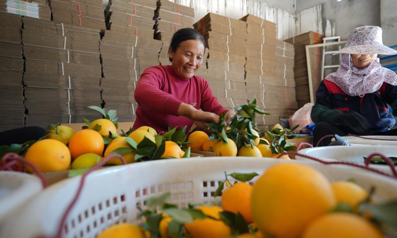 Farmers sort navel oranges at a plantation in Xiaru Village of Shashi Township in Ganzhou City, east China's Jiangxi Province, Nov. 12, 2020. Ganzhou City has planted more than 1.7 million mu (about 113,333 hectares) of navel oranges, with an expected annual output of over 1 million tonnes. (Xinhua/Zhou Mi)