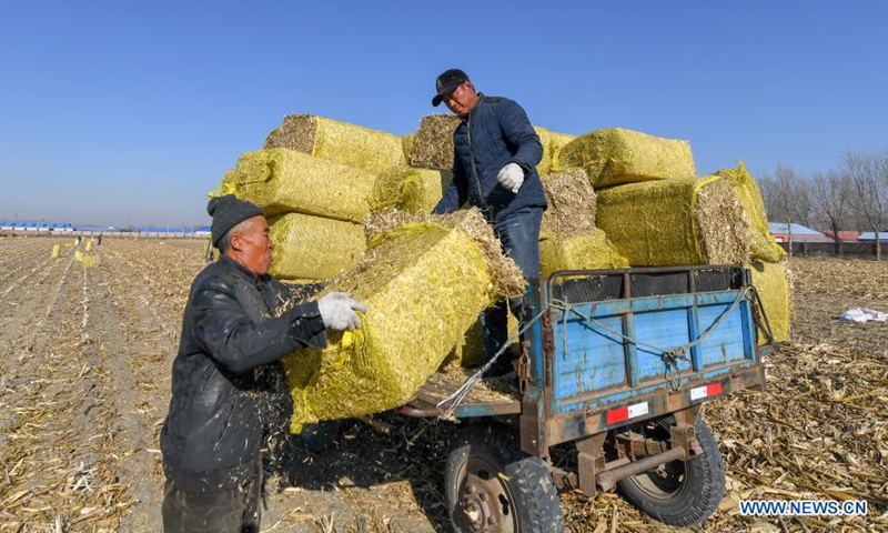 Farmers load packed crop straws onto a vehicle in Tuanjie Village of Shanyou Township in Songyuan City, northeast China's Jilin Province, Nov. 5, 2020. Jilin Province has prioritized the comprehensive utilization of crop straws, which can be transformed into fuels, fertilizers and forage. The province produces around 40 million tonnes of crop straws every year, among which more than 28 million tonnes had been utilized in 2019. (Xinhua/Zhang Nan)