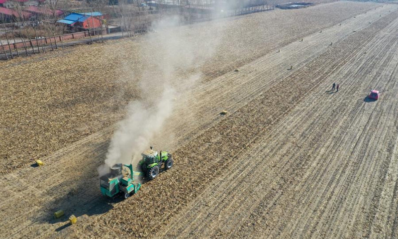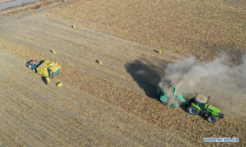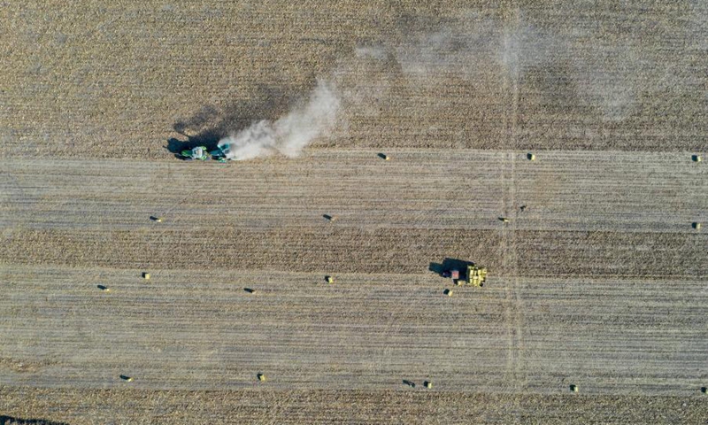 In this aerial photo taken on Nov. 5, 2020, an agricultural machine processes crop straws in Tuanjie Village of Shanyou Township in Songyuan City, northeast China's Jilin Province. Jilin Province has prioritized the comprehensive utilization of crop straws, which can be transformed into fuels, fertilizers and forage. The province produces around 40 million tonnes of crop straws every year, among which more than 28 million tonnes had been utilized in 2019. (Xinhua/Zhang Nan)