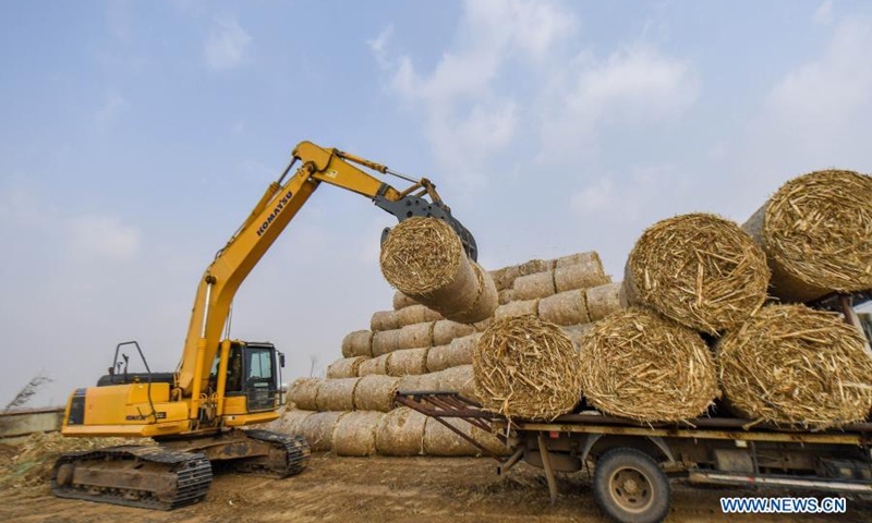 An agricultural machine piles packed crop straws in Siping City, northeast China's Jilin Province, Nov. 12, 2020. Jilin Province has prioritized the comprehensive utilization of crop straws, which can be transformed into fuels, fertilizers and forage. The province produces around 40 million tonnes of crop straws every year, among which more than 28 million tonnes had been utilized in 2019. (Xinhua/Zhang Nan)