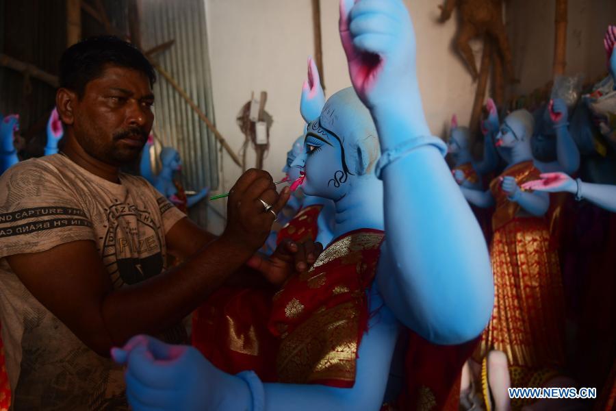 An idol maker colors the idols of Goddess Kali ahead of Diwali festival at Agartala, the capital city of India's northeastern state of Tripura, Nov. 12, 2020. (Str/Xinhua)