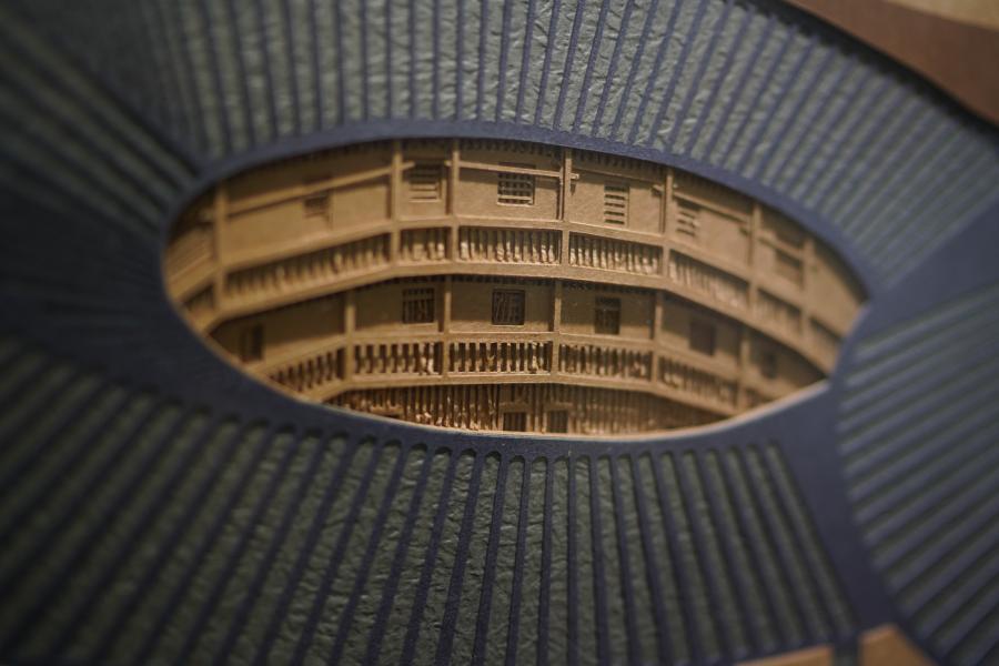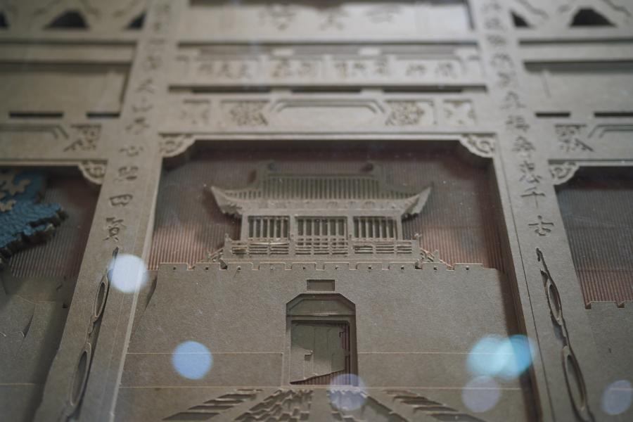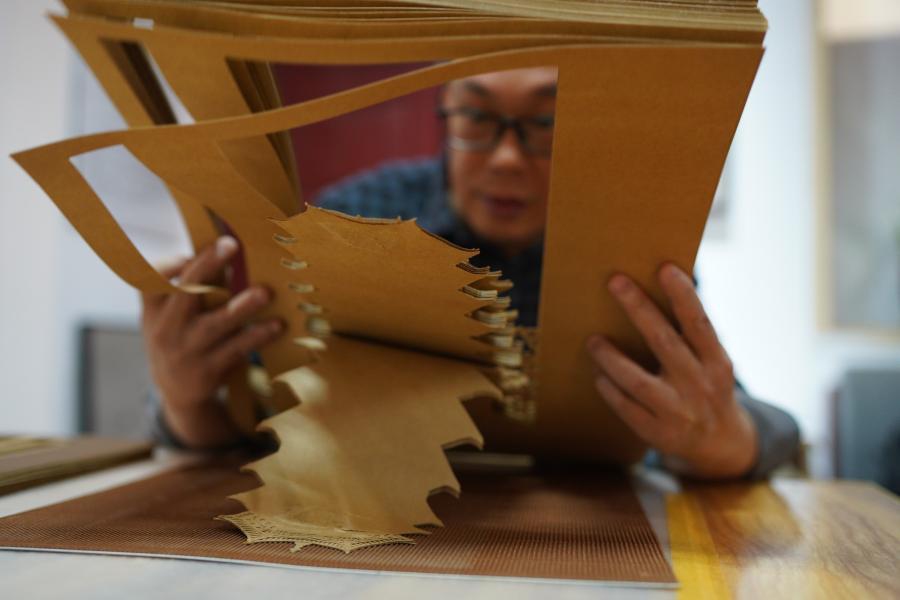 Paper carving artist Zhang Shoujiang shows artworks made of more than 30 layers of coated papers at his studio in Ganzhou, east China's Jiangxi Province, Nov. 12, 2020. (Xinhua/Zhou Mi)