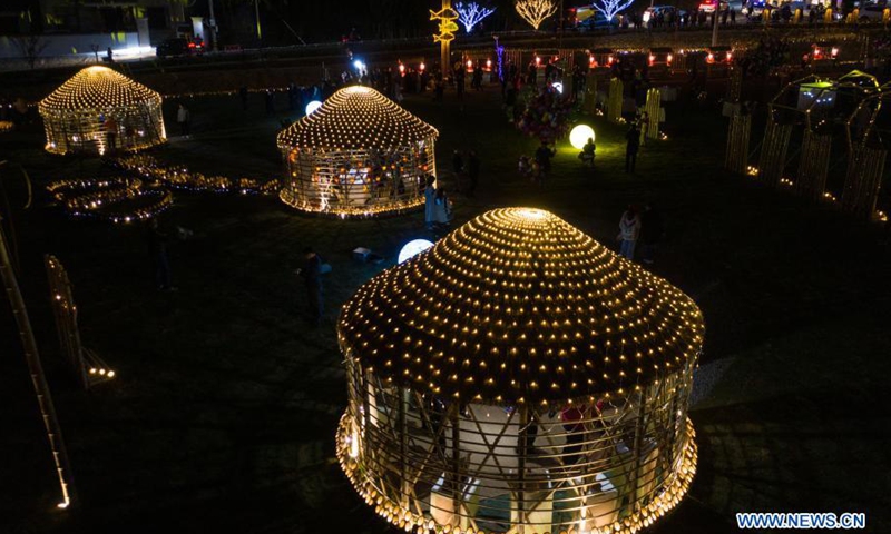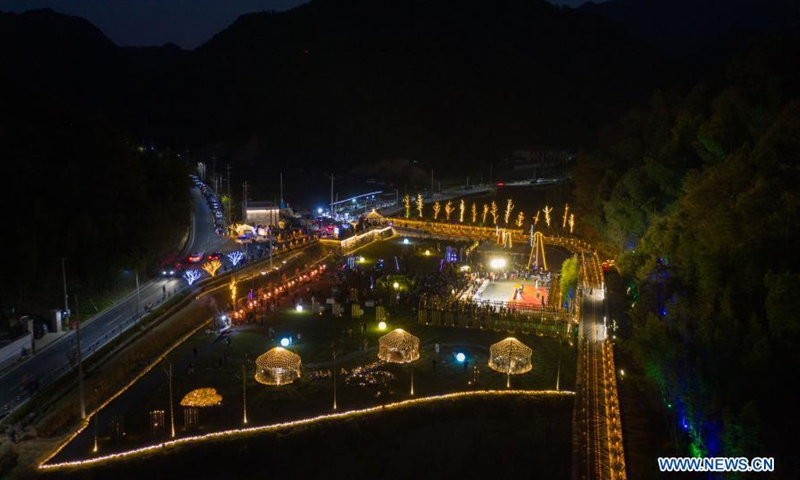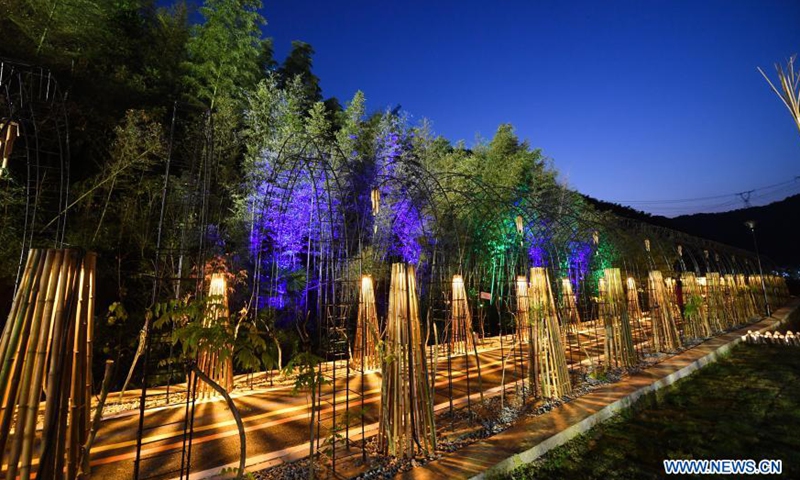 Aerial photo taken on Nov. 13, 2020 shows a light show held in Tangchang Village of Yongchang Town, Hangzhou, east China's Zhejiang Province. Boasting rich bamboo resources, Tangchang Village held a light show Friday night, displaying varied light installations made of bamboos.Photo:Xinhua