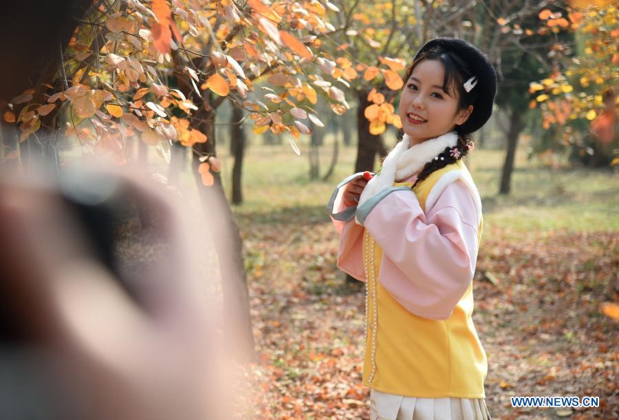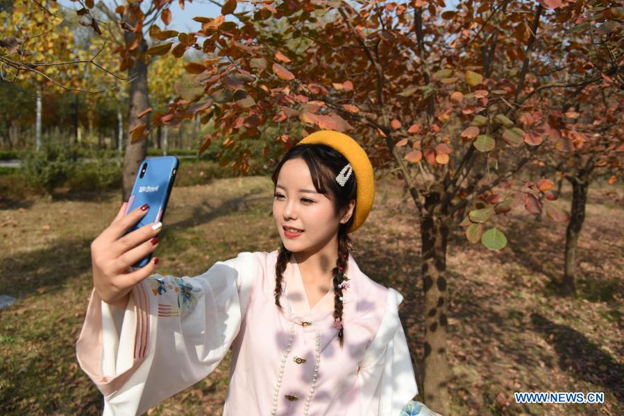 Sun Yan, an online clothes store owner, poses for photos with the costume she designed in the fusion of the traditional clothing of the Han ethnic group that is generally called Hanfu, in Sunzhuang Village in Caoxian County of Heze City, east China's Shandong Province, Nov. 10, 2020. Sunzhuang Village thrives on e-commerce business. Among some 760 households in the village, more than 560 run online clothes stores on Taobao.com, Alibaba's main e-commerce site. The village's sales volume of costumes exceeded 200 million yuan (about 30.22 million U.S. dollars) in 2019. (Xinhua/Wang Kai)