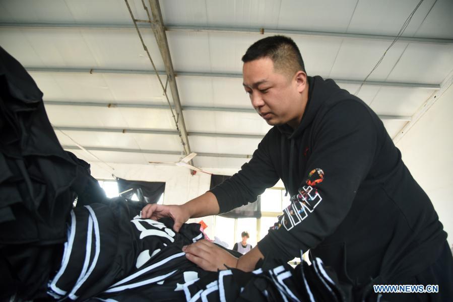Sun Kangjia, an online clothes store owner, arranges costumes for sale to Japan at Sunzhuang Village of Caoxian County in Heze, east China's Shandong Province, Nov. 9, 2020. Sunzhuang Village thrives on e-commerce business. Among some 760 households in the village, more than 560 run online clothes stores on Taobao.com, Alibaba's main e-commerce site. The village's sales volume of costumes exceeded 200 million yuan (about 30.22 million U.S. dollars) in 2019. (Xinhua/Wang Kai)
