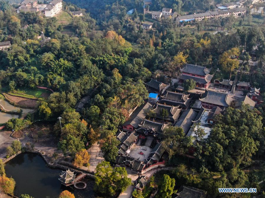 Aerial photo shows a view of the Dazu Rock Carvings scenic area at Dazu District of southwest China's Chongqing Municipality on Nov. 12, 2020. The scenic spot has seen an increasing number of tourists since its reopening in June, with some 2,000 a day. More than 50,000 individual rock carvings lie in the grottoes of Chongqing's Dazu District. The carvings date from the 9th to 13th centuries and entered on the World Heritage List by the United Nations Educational, Scientific and Cultural Organization in 1999. (Xinhua/Liu Chan)