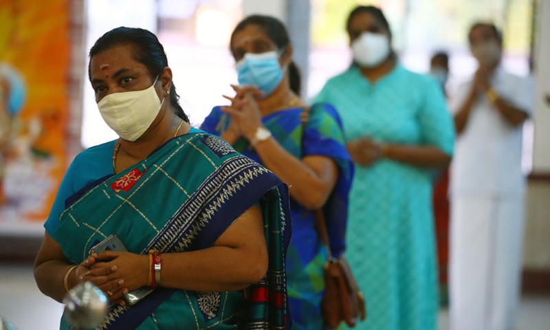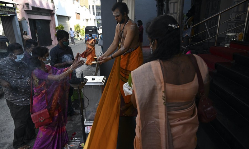 Worshippers offer prayers during Diwali, or the Festival of Lights, at a Hindu temple amid the COVID-19 outbreak in Colombo, Sri Lanka, Nov. 14, 2020. (Photo: Xinhua)