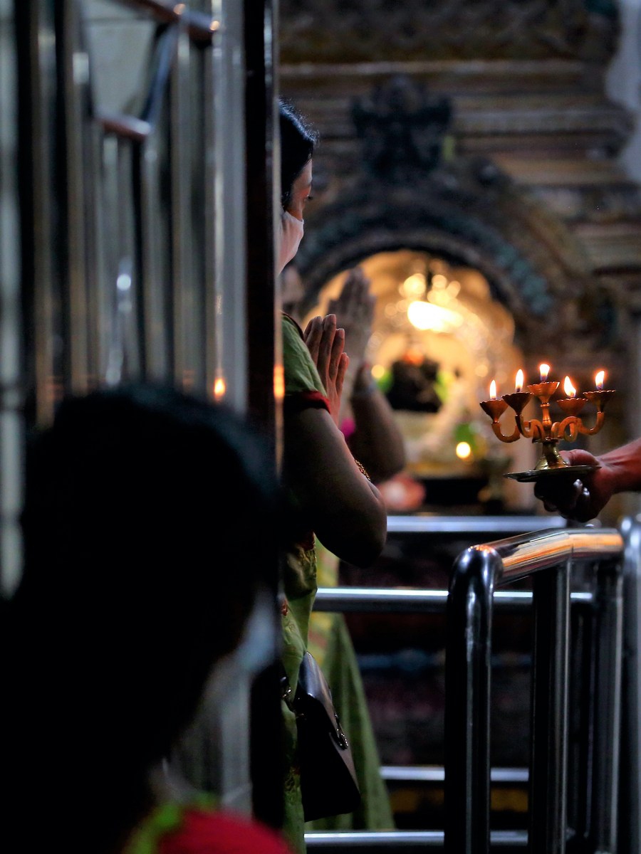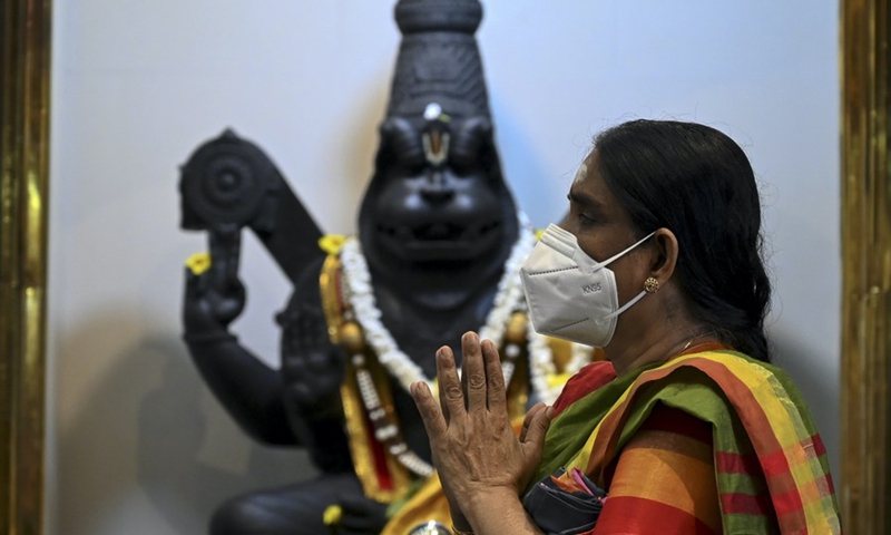 A worshipper offers prayers during Diwali, or the Festival of Lights, at a Hindu temple amid the COVID-19 outbreak in Colombo, Sri Lanka, Nov. 14, 2020. (Photo: Xinhua)