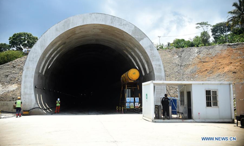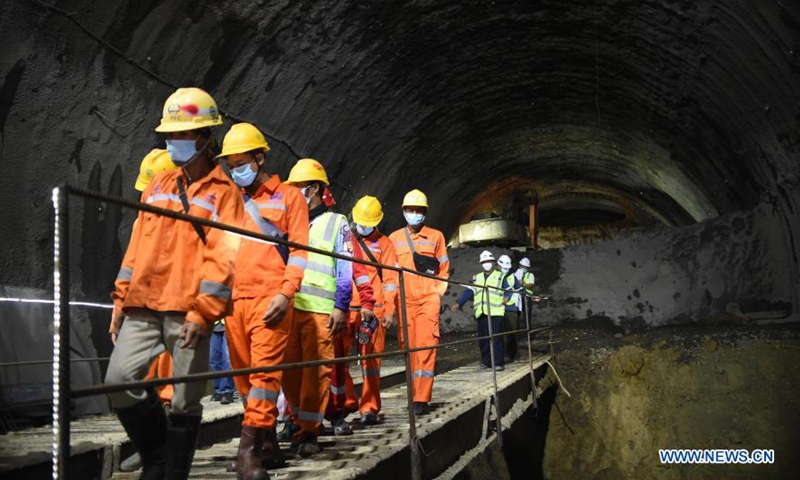 Workers are seen at the construction site of the Tunnel 7 of the Jakarta-Bandung high-speed railway project in West Java province, Indonesia, Nov. 15, 2020. The Tunnel 7 was successfully drilled through. (Xinhua/Zulkarnain)