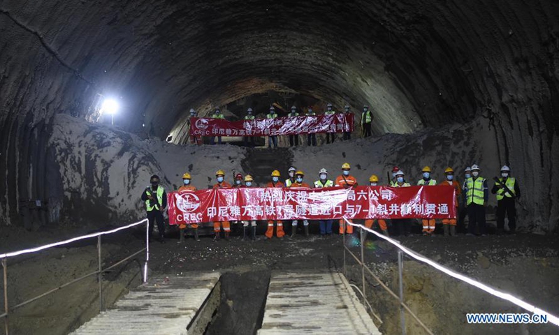 Workers celebrate the breakthrough of the Tunnel 7 of the Jakarta-Bandung high-speed railway project in West Java province, Indonesia, Nov. 15, 2020. The Tunnel 7 was successfully drilled through. (Xinhua/Zulkarnain)