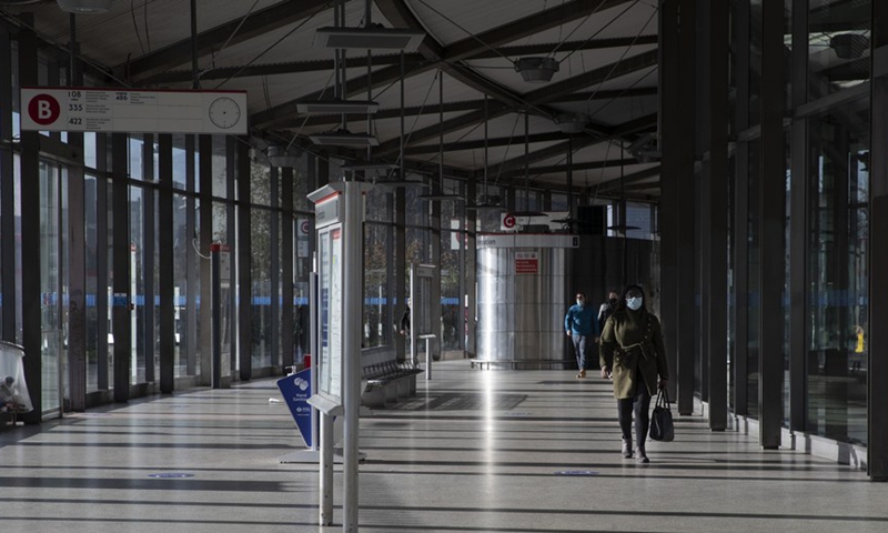 People wearing face masks walk in a bus stop in London, Britain, on Nov. 12, 2020. (Xinhua/Han Yan)