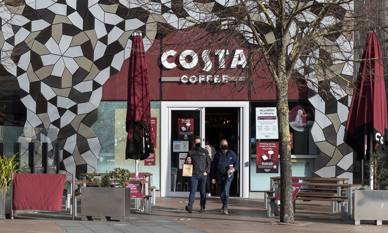 People wearing face masks walk out of a coffee shop in London, Britain, on Nov. 12, 2020. (Xinhua/Han Yan)