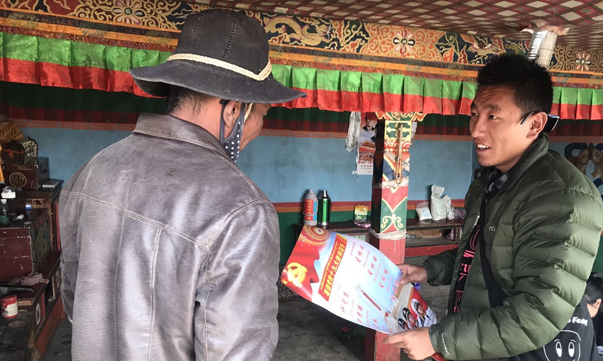Tsering Tarchin, a poverty-alleviation official, explains national policies and guidelines to villagers in Ali prefecture in Southwest China's Tibet Autonomous Region. Photo: Courtesy of Tsering Tarchin
