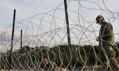 Soldiers from the Kentucky-based 19th Engineer Battalion work in a public park in Laredo, Texas, where they are installing barbed and concertina-wire on Saturday. The soldiers are some of the thousands of US troops deployed to the US-Mexico border as part of a mission ordered by President Donald Trump to toughen the frontier and provide engineering and logistical support to Customs and Border Protection agents. Photo: AFP