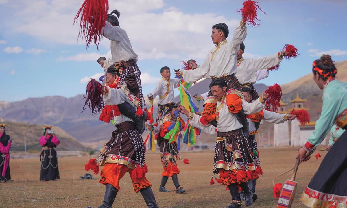 Dancers perform the Xianzi Dance in Nangqian county, Qinghai Province, on October 17. Photo: VCG