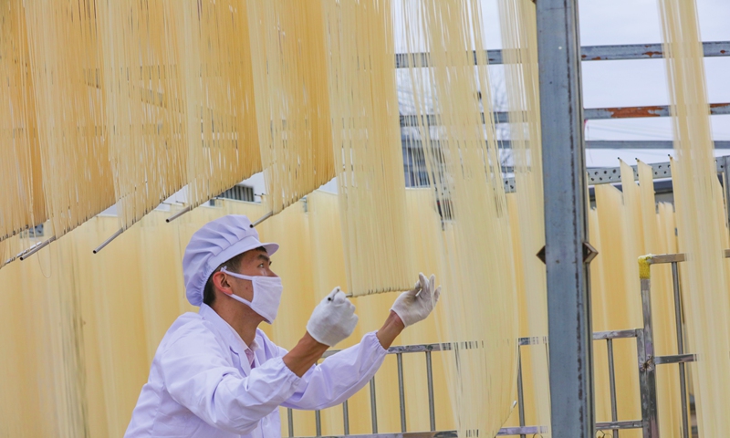 A farmer hangs noodles to dry in a village workshop in Xinyang, Central China's Henan Province on Wednesday. The workshop uses unified production procedures, packaging and trademarks, and it relies on e-commerce to reach markets across the country, creating jobs for 65 villagers. Photo: cnsphoto