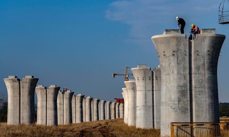 Employees work on the construction site of Zhuogang Grand Bridge of the Huanggang-Huangmei high-speed railway in Huangmei County, central China's Hubei Province. The 125.12-km Huanggang-Huangmei high-speed railway in Hubei Province, is designed to run at a speed of 350 km per hour. (Xinhua/Du Huaju)