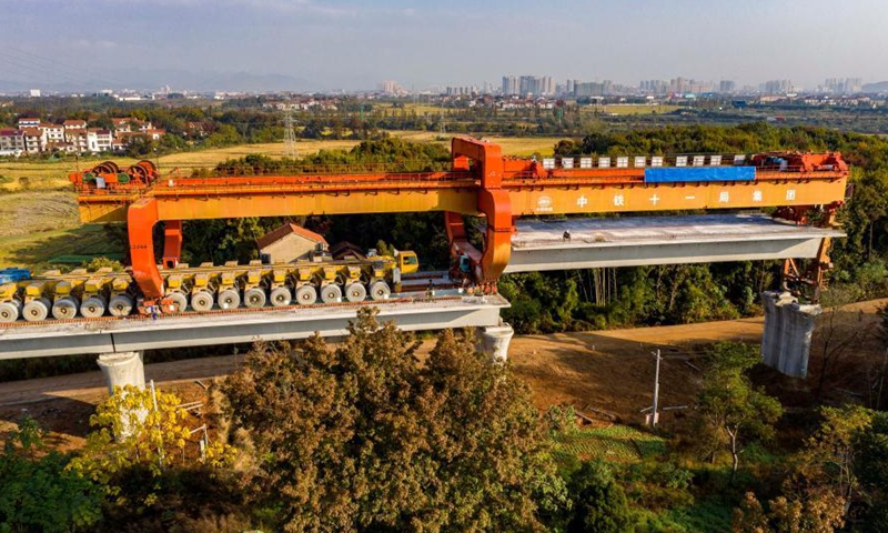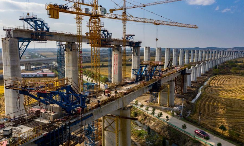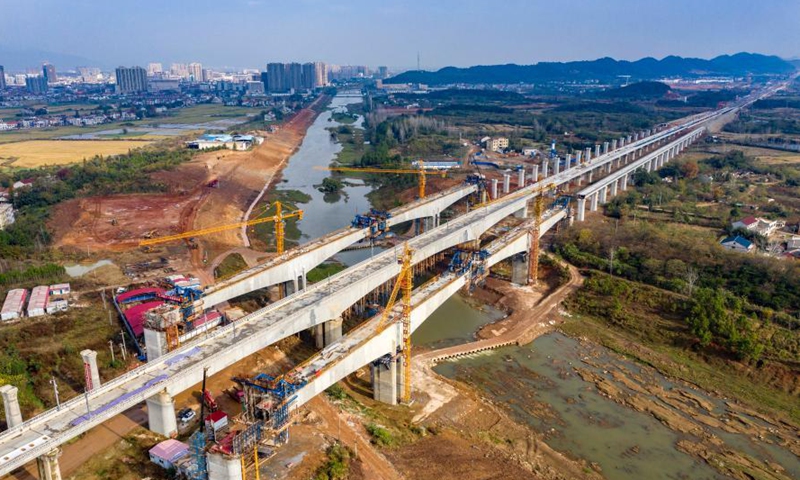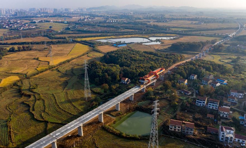 Aerial photo taken on Nov. 18, 2020 shows the construction site of Zhuogang Grand Bridge of the Huanggang-Huangmei high-speed railway in Huangmei County, central China's Hubei Province. The 125.12-km Huanggang-Huangmei high-speed railway in Hubei Province, is designed to run at a speed of 350 km per hour. (Xinhua/Du Huaju)