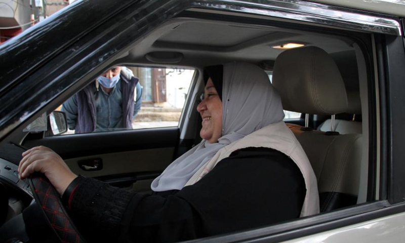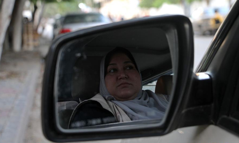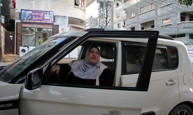 Palestinian Nayla Abu Jubbah, sits at her vehicle as she works in Gaza City, on Nov. 18, 2020. Nayla, 39, is the first female taxi driver in the Gaza Strip, she started a small taxi office to deliver women only and called it "Al-Mukhtara Taxi". (Photo by Rizek Abdeljawad/Xinhua)