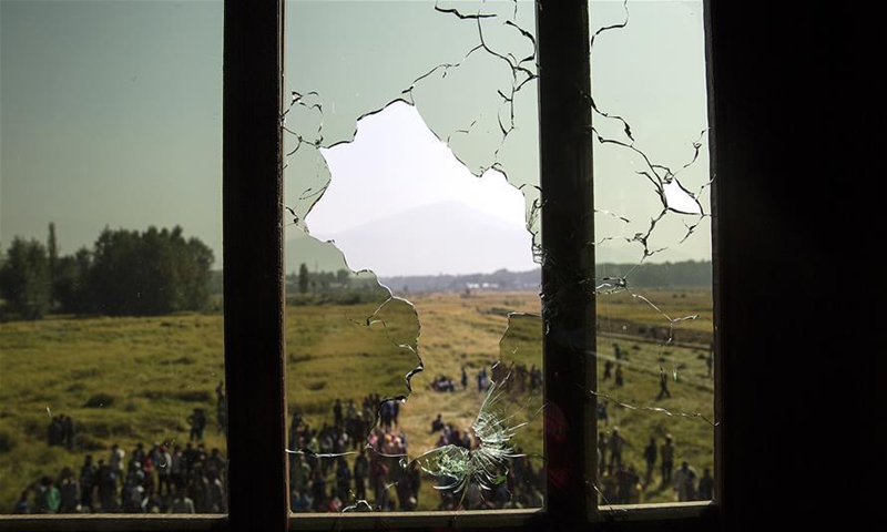 People gather outside a house as seen from a broken glass pane after a gunfight at village Samboora of Pulwama district, about 15 km south of Srinagar city, the summer capital of Indian-controlled Kashmir, Sept. 28, 2020. Two militants were killed in an ongoing fierce gunfight in restive Indian-controlled Kashmir, police said Monday. (Xinhua/Javed Dar)
