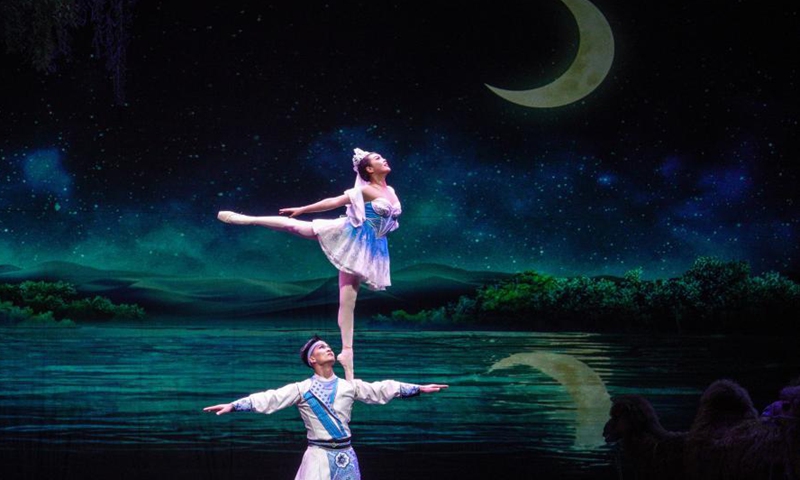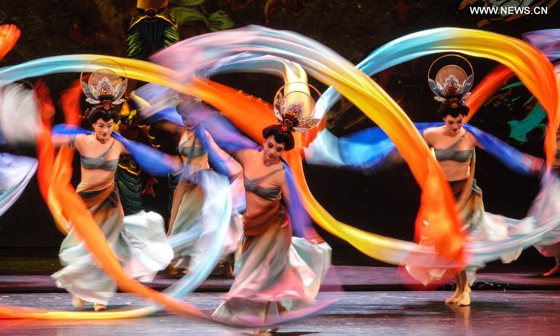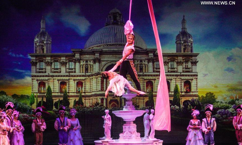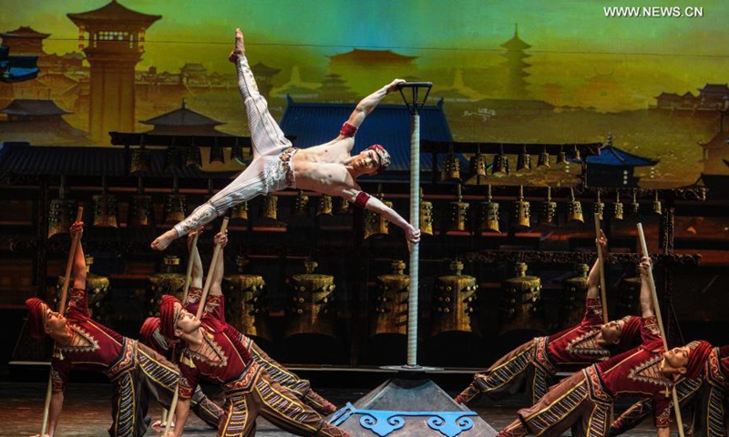 Actors perform during an acrobatic show in Sheyang County of Yancheng, east China's Jiangsu Province, Nov. 20, 2020. The show, which reappeared the legendary journey of Chinese merchants of the Tang Dynasty (618-907 AD) along the Silk Road, was presented during the 14th Red-crowned Crane Culture and Art Festival on Friday.Photo:Xinhua