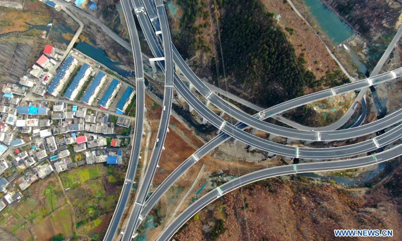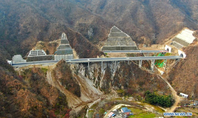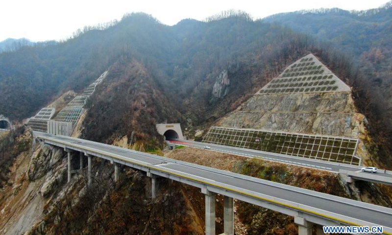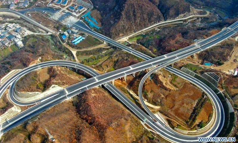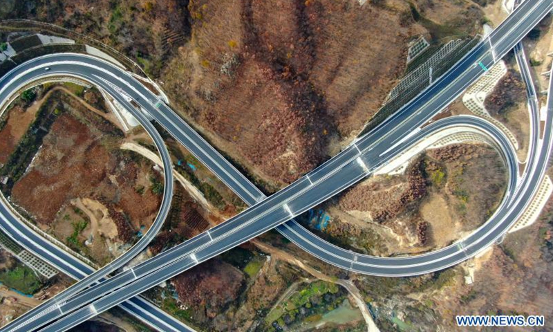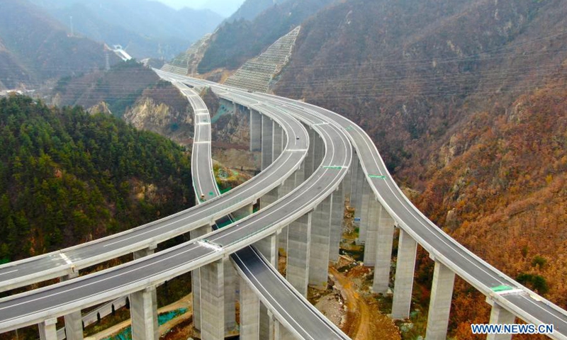 Aerial photo taken on Nov. 19, 2020 shows the Yaoshan-Luanchuan section of the Zhengxi expressway in central China's Henan Province. The 80-kilometer expressway section winds through the Funiu Mountains, linking Yaoshan Town of Pingdingshan and Miaozi Town of Luoyang, which is expected to open to traffic by the end of 2020.Photo:Xinhua