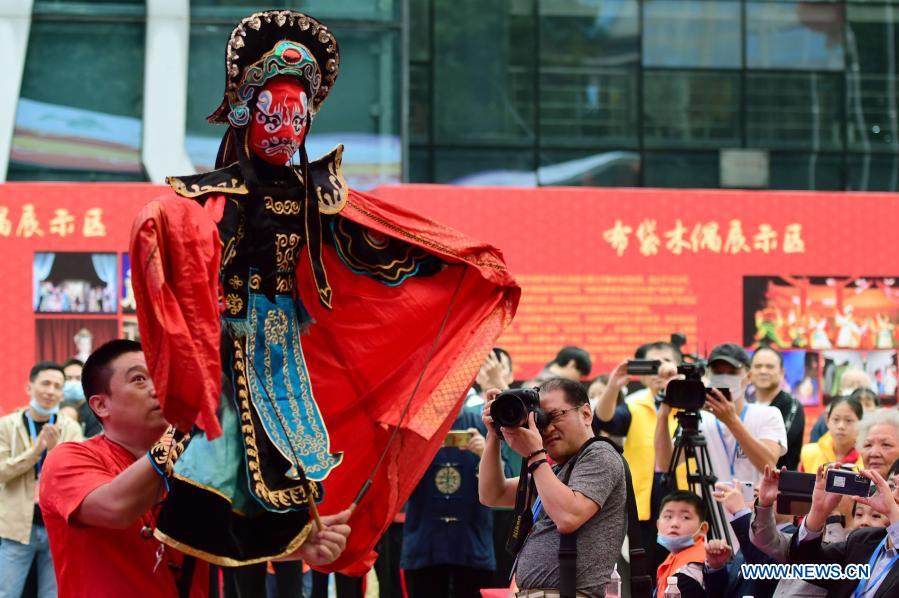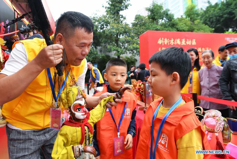 Actors from Quanzhou puppet show troupe give a performance in Fuzhou, southeast China's Fujian Province, Nov. 21, 2020. A cross-Strait research activity to help inherit the puppet show among teenagers was started in Fuzhou on Saturday, with different forms of interaction and learning activities attended by students and inheritors of puppet show. (Xinhua/Wei Peiquan)