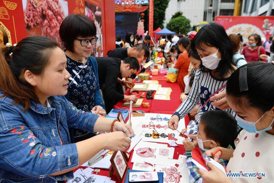 Students try the Pucheng paper-cutting in Fuzhou, southeast China's Fujian Province, Nov. 21, 2020. A cross-Strait research activity to help inherit the puppet show among teenagers was started in Fuzhou on Saturday, with different forms of interaction and learning activities attended by students and inheritors of puppet show. (Xinhua/Wei Peiquan)