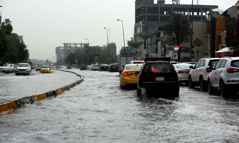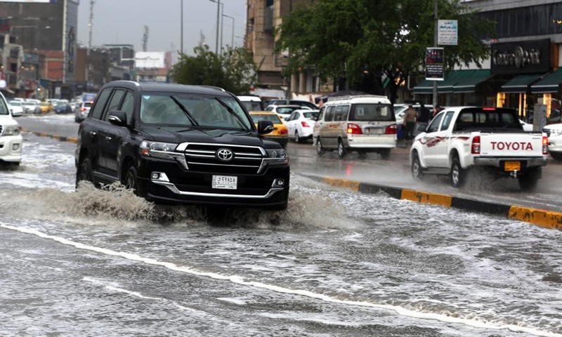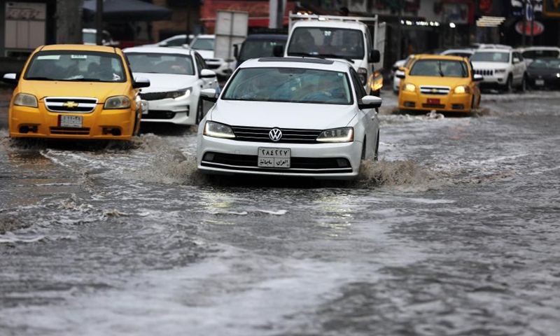 Vehicles run on flooded roads due to heavy rains in Baghdad, Iraq, on Nov. 21, 2020. (Xinhua)