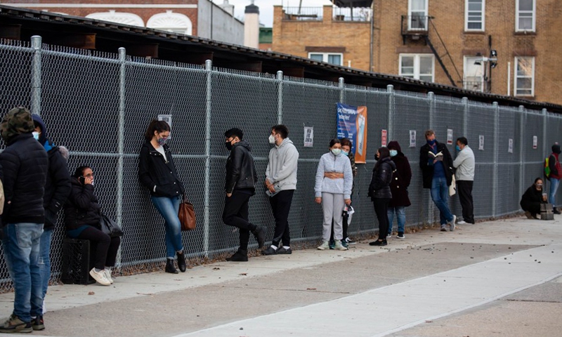 People wait in line at a COVID-19 testing point in the Brooklyn borough of New York, the United States, on Nov. 21, 2020. (Photo by Michael Nagle/Xinhua)