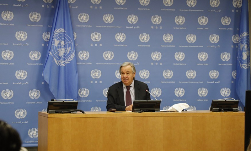 United Nations Secretary-General Antonio Guterres speaks at a press conference at the UN Headquarters in New York, Nov. 20, 2020. Antonio Guterres on Friday called on the leaders of the Group of 20 (G20) to act and cooperate to collectively cope with common threats and challenges before meeting with them online over the weekend. (Xinhua/Xie E)