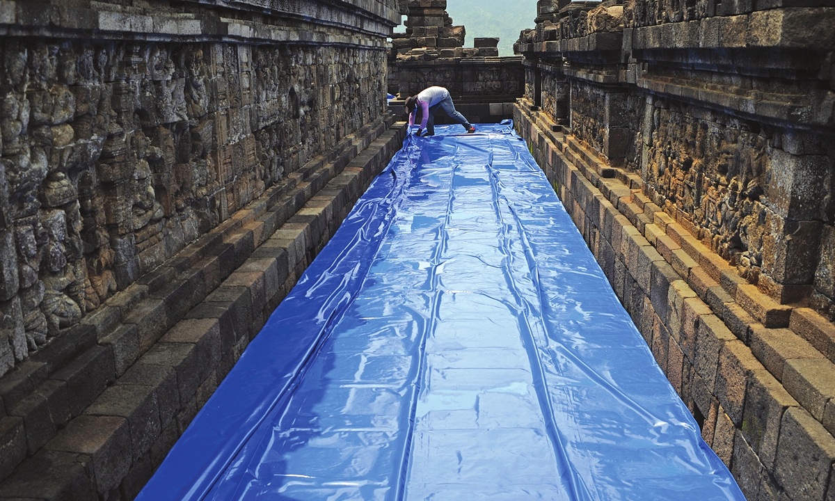 A worker covers the floor with a tarp at the Borobudur temple in Magelang, Indonesia on Monday, after the Indonesia Geological agency raised the status alert for Mount Merapi to the second highest ahead of a possible eruption. About 500 people have evacuated the area near Mount Merapi. Photo: AFP