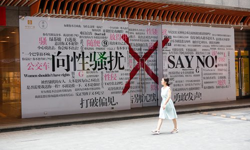 A woman passes a poster that reads "say no to sexual harassment" on the wall of a shopping mall in Xi'an, capital of Northwest China's Shaanxi Province on Friday. Many victims in China have spoken up against sexual harassment in recent months. Photo: IC