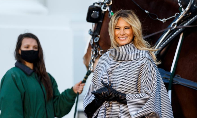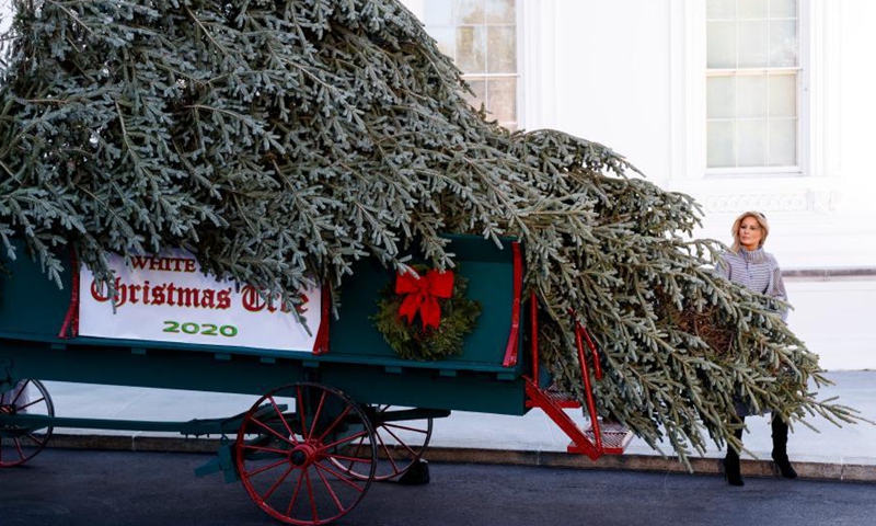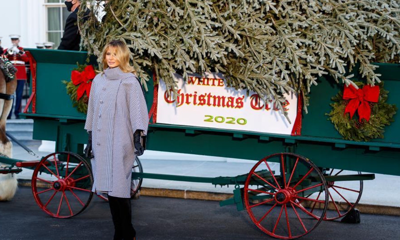 U.S. first lady Melania Trump welcomes the arrival of the 2020 White House Christmas Tree at the White House in Washington, D.C., the United States, Nov. 23, 2020. (Photo by Ting Shen/Xinhua)