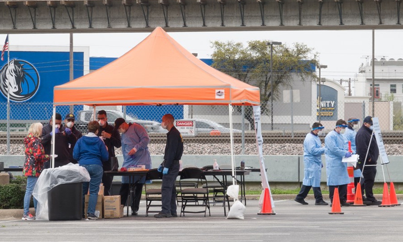 Medical workers work at a drive-through COVID-19 testing site in Dallas, Texas, the United States, March 21, 2020. (Photo by Dan Tian/Xinhua)