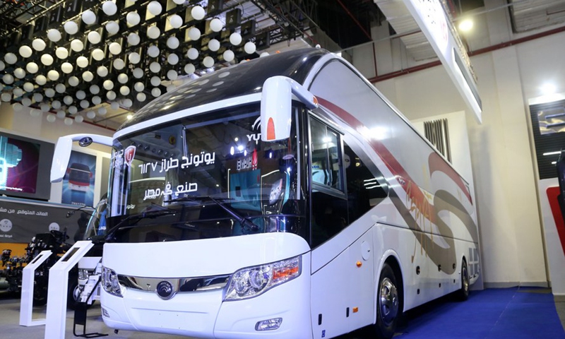 A bus made by China's Yutong is displayed at the TransMEA 2020 in Cairo, Egypt, on Nov. 23, 2020. (Xinhua/Mohamed Asad)